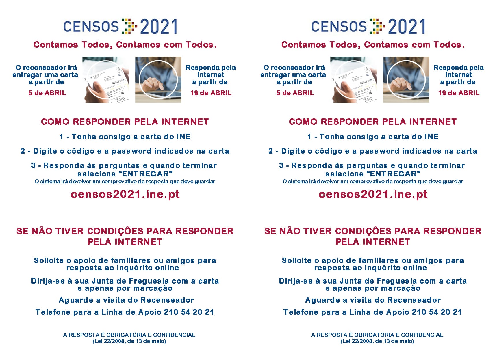 Contamos Todos, Contamos com Todos. O recenseador irá entregar uma carta a partir de 5 DE ABRIL. Responda pela Internet a partir de 19 DE ABRIL.