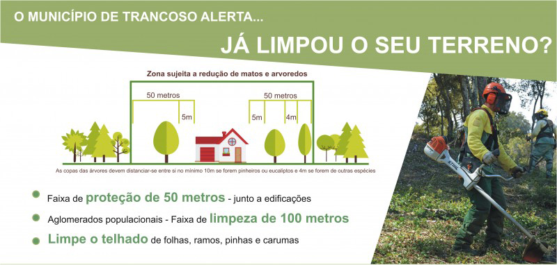O Gabinete Técnico Florestal de Trancoso informa que, no âmbito da Defesa da Floresta Contra Incêndios, os terrenos junto aos edifícios e aos aglomerados populacionais devem ser limpos até ao dia 15 de maio de 2021.