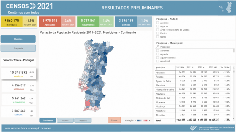 Estes são os primeiros resultados oficiais dos CENSOS 2021 e têm um carácter preliminar, na medida em que são baseados em contagens resultantes do processo de recolha e divulgados antes do final do processo de tratamento e validação da informação recolhida.
